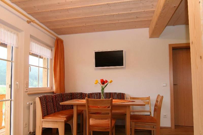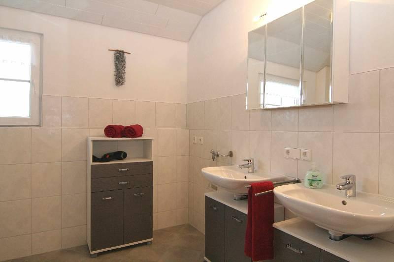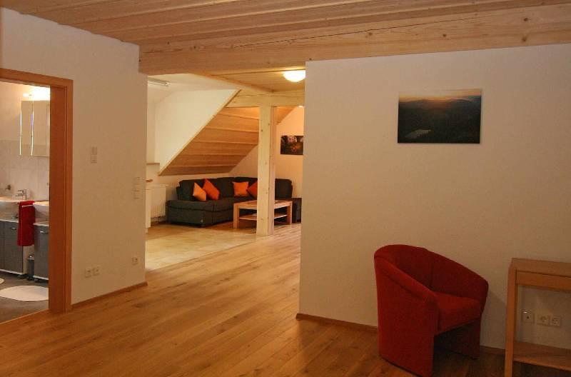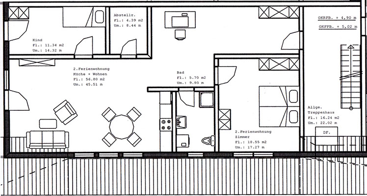 2. Obergeschoß mit zwei Schlafzimmern, einer großen Wohnküche mit Couchecke und SAT-TV, einem Bad mit Du/WC und Doppelwaschbecken und einem Vorratsraum.