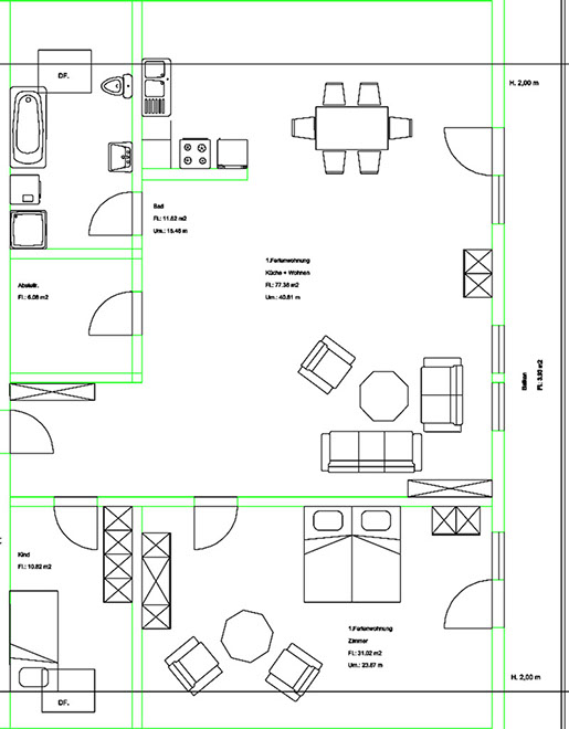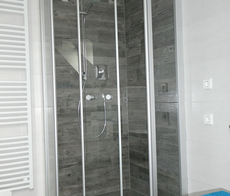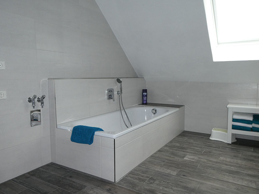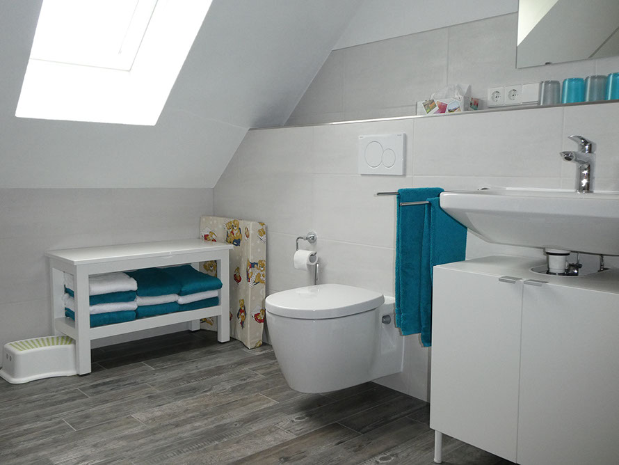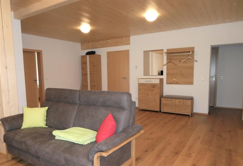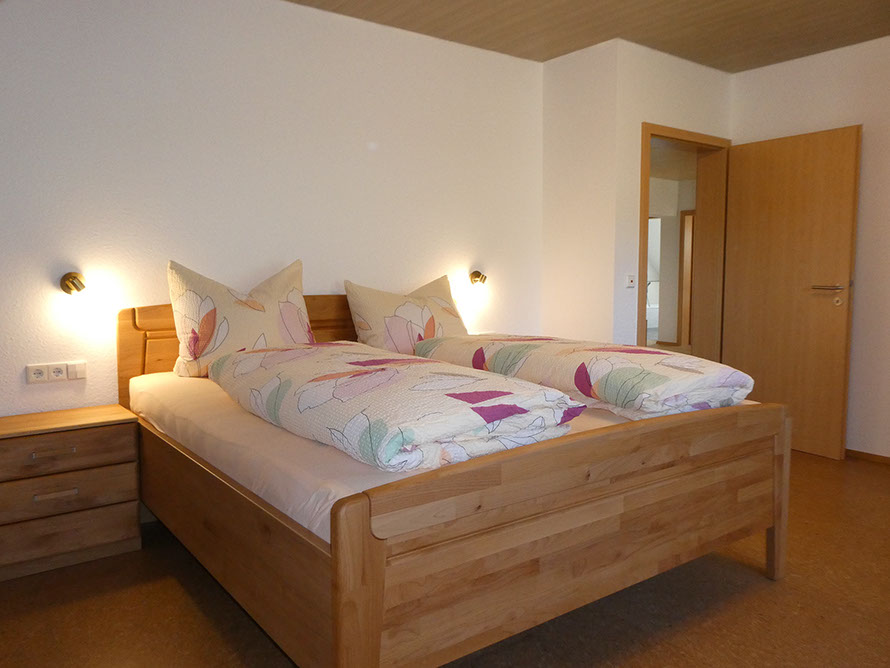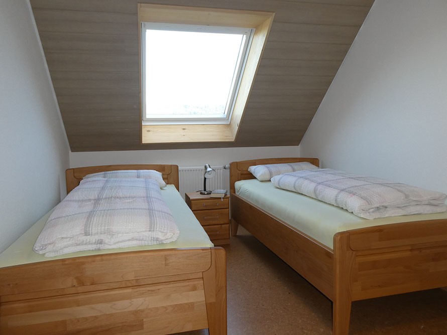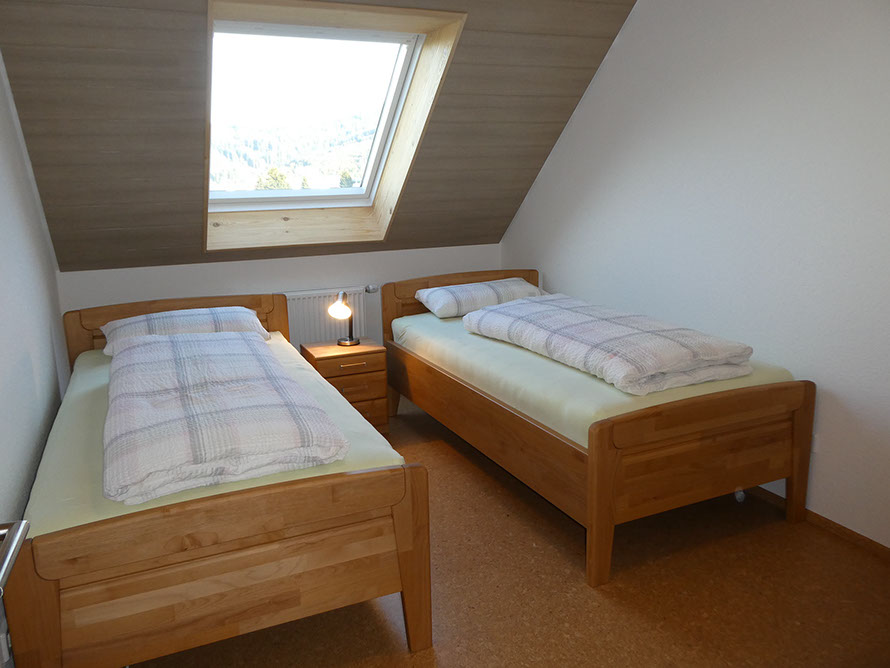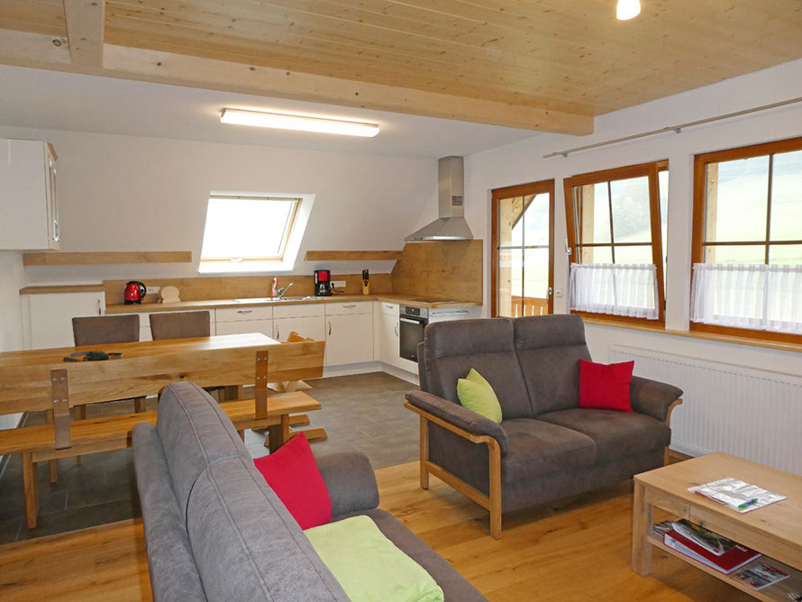 Unsere zweite Ferienwohnung bietet mit 110 m² ausreichend Platz für größere Familien oder Gruppen. Sie verfügt über drei Schlafzimmer, eine große Wohnküche mit Couchecke und SAT-TV, einem Bad mit Dusche, WC und Badewanne, ein separates WC und einen Vorratsraum. Vom Balkon auf der Nordseite hat man einen schönen Blick auf unsere Wiesen und den Wald.